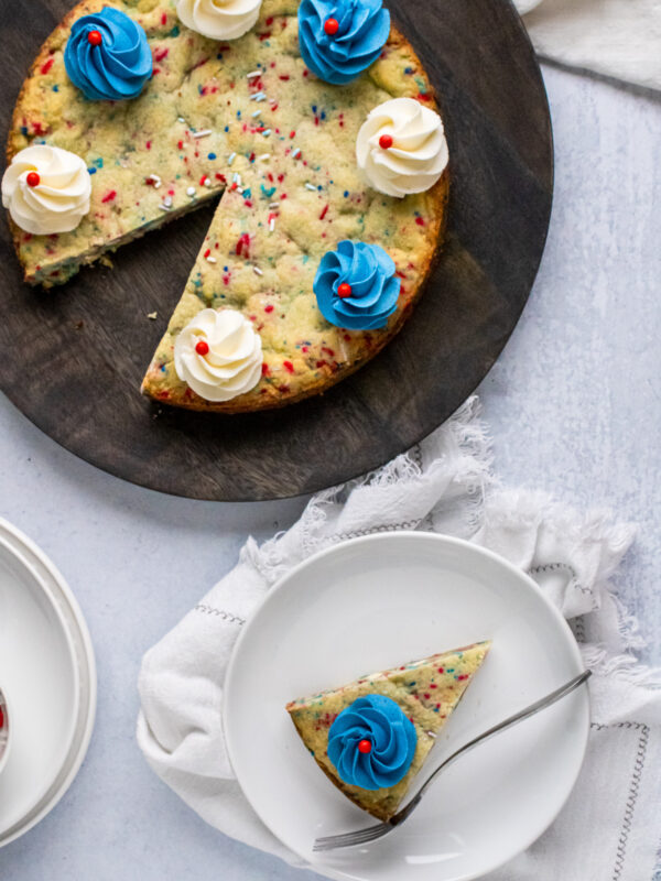I remember loving cookie cakes growing up, but for some reason I stopped eating them. I remember get them at the mall. So about five years ago, I decided to make a cookie cake. There is something about jimmies and cookies that I just love, which is one of the reasons I love this cookie cake. It is just a big sugar cookie in a cake form. This one is filled with sprinkles and white chocolate chips. I love this cookie cake for an easy dessert. It has a little bit of buttercream, but you don’t have to add the buttercream. I personally like it better with buttercream.
